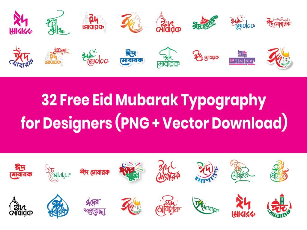 To help designers, we have created a collection of 32 stylish Eid Mubarak typography designs that you can download and use in your creative projects.